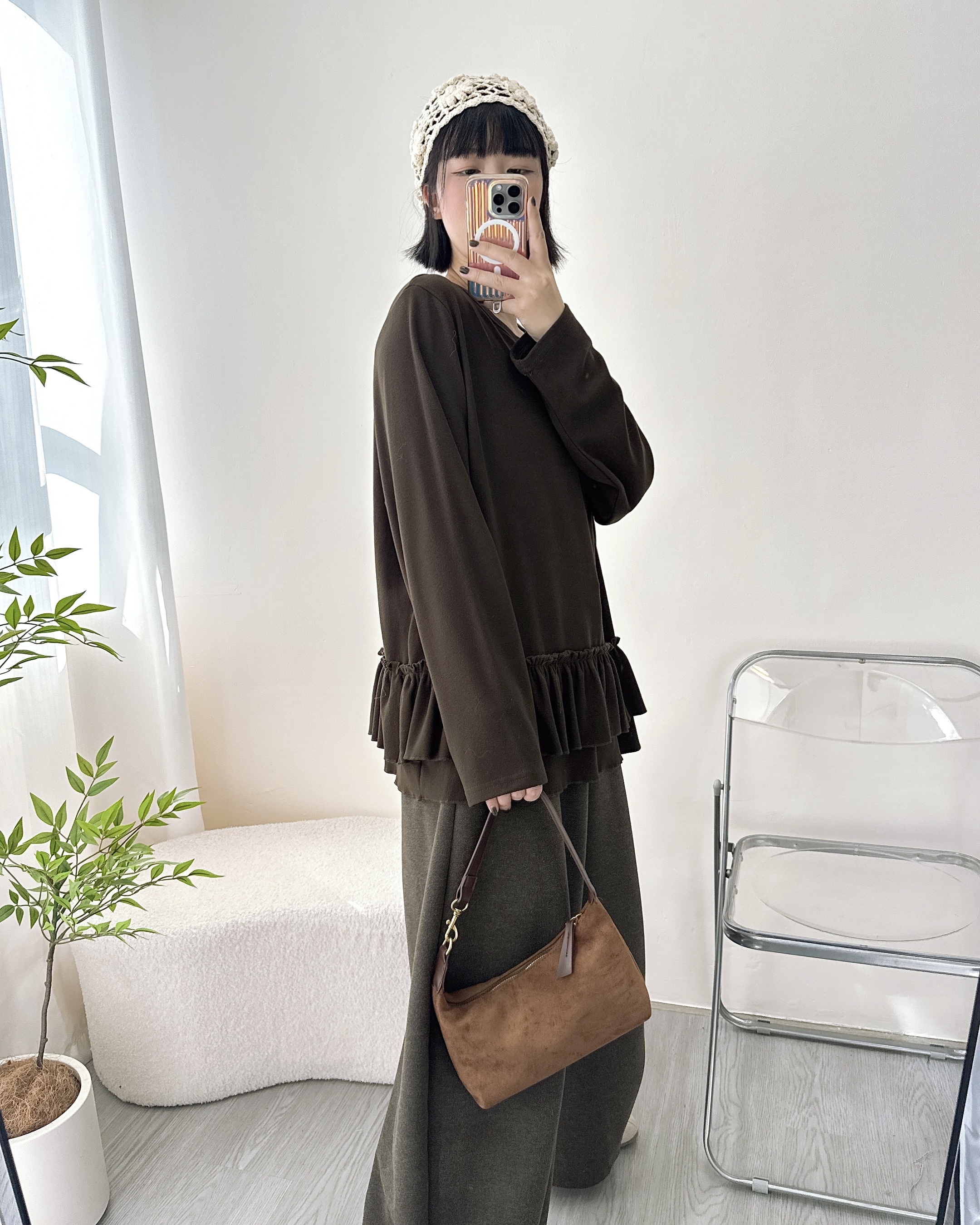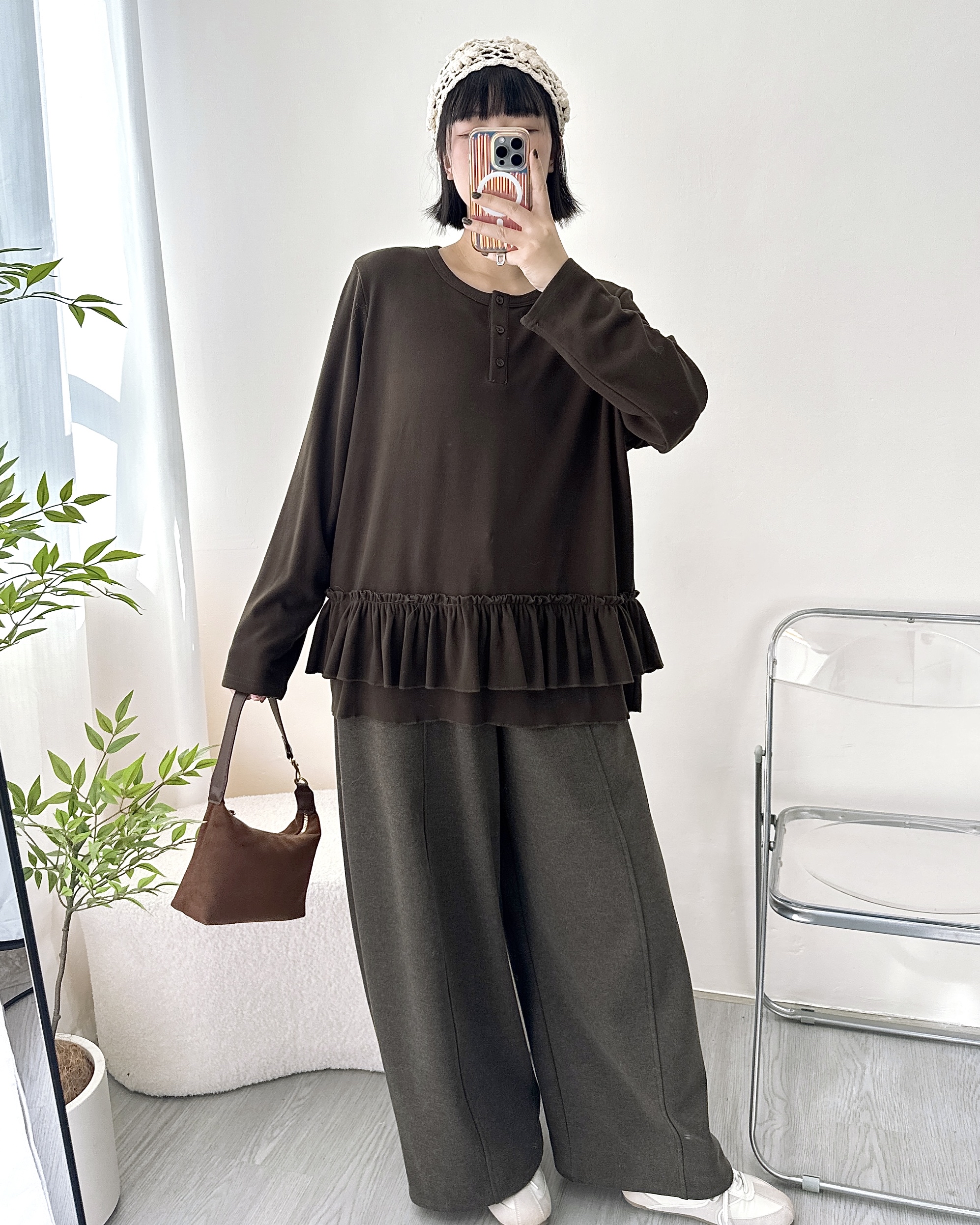 質地非常柔軟,有彈性~ 保暖磨毛料,寬鬆垂感👍🏻 最鍾意佢下擺雙層Ruffle設計,大愛💟 胸44吋/腰44吋/長26吋